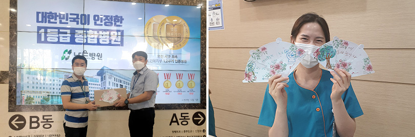 ▲ (좌)인천 서구노인복지관 관계자(왼쪽)가 ‘덕분에 챌린지 부채’를 나은병원 관계자(오른쪽)에게 전달하고 있다. / (우)의료진이 SK인천석유화학 구성원과 가족 봉사단, 독거노인이 함께 만든 ‘덕분에 챌린지 부채’를 들고 있다.
