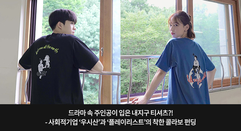 페트병 재활용을 통해 이산화탄소를 28%나 줄여주는 ‘우시산’의 업사이클링 제품을 ‘플레이스트’는 새로운 웹드라마 ‘내리겠습니다 지구에서(이하 내지구)’에 담아냈다. 두 기업의 콜라보레이션으로 진행되는 이번 프로젝트는 드라마 스토리에 사회적가치가 담긴 제품을 자연스럽게 녹여내 드라마 시청이 곧 공익활동 참여로 이어질 수 있도록 기획됐으며, 이를 위해 ‘내지구’의 주연 배우들도 직접 티셔츠의 모델로 나섰다. MZ세대들의 선한 영향력을 더 좋은 곳에 집중시키고자 사회적기업과 콘텐츠 제작사, 그리고 배우들까지 함께 뜻을 모은 것이다.