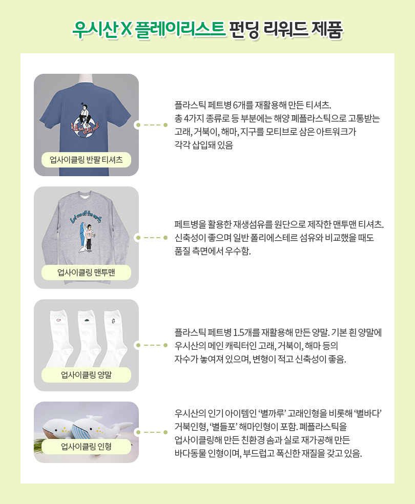 ‘우시산’은 죽은 고래 뱃속에서 엄청난 양의 폐플라스틱이 나온 것을 본 뒤, 바다에 무분별하게 버려지는 플라스틱을 줄이기 위한 방안으로 플라스틱을 이용한 친환경 원사를 만들어 업사이클링 제품을 제작하게 됐다. 이렇게 일련의 과정을 거친 해양 폐플라스틱은 생활 속에서 입을 수 있는 티셔츠와 양말이 됐고, 웹드라마 ‘내지구’에서 주인공들의 반 티셔츠가 됐다.