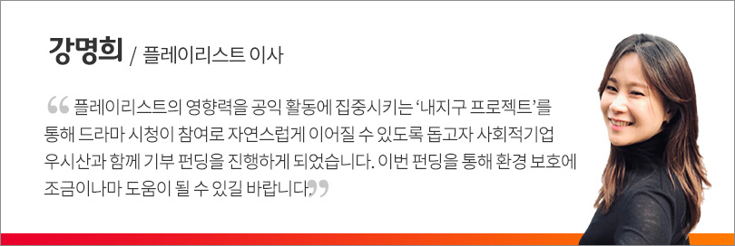 10월 8일, 친환경 사회적기업 ‘우시산’과 연애플레이리스트(연플리), 에이틴 등 청춘 웹드라마로 유명한 ‘플레이리스트’가 네이버 해피빈에 ‘내지구 프로젝트’ 펀딩을 오픈했다. SK이노베이션이 육성 지원하는 ‘우시산’은 해양 폐플라스틱을 업사이클링**해 티셔츠, 에코백 등 다양한 친환경 제품을 만드는 사회적기업이며, ‘플레이리스트’는 MZ세대들이 공감할 수 있는 스토리를 녹인 드라마로 시청자들과 소통하는 디지털 콘텐츠 제작사다.