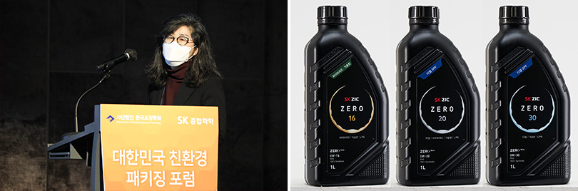 ▲ (좌) ‘Recycling : Material Supplier & Convertor’를 주제로 한 세 번째 세션에서 SK종합화학 강선영 CTO가 발표를 진행하고 있다. / (우) 용기까지 친환경인 친환경 엔진오일 ‘SK ZIC ZERO’