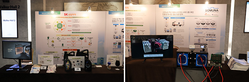 ▲ (좌) ‘SK ZIC ZERO’와 열분해유를 활용한 석유화학 시제품을 전시한 SK종합화학 / (우) ‘無시동 차량 배터리 전장제어 시스템’을 전시한 소셜벤처 ‘소무나’
