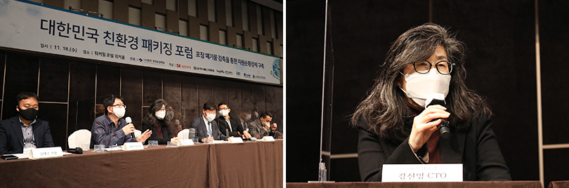 ▲ (좌) 세 번째 세션의 주제로 진행된 패널 토론 / (우) 발언 중인 SK종합화학 강선영 CTO