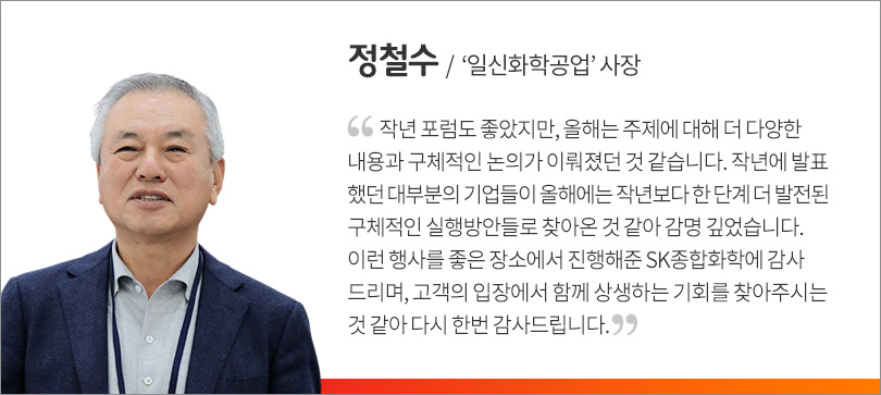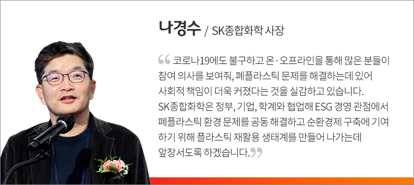 포럼 첫 날은 SK종합화학 나경수 사장의 클로징 스피치로 마무리됐다. 나경수 사장은 폐플라스틱 문제 해결을 위해 자발적으로 포럼에 함께한 민∙관∙학에 감사의 말을 전했다.