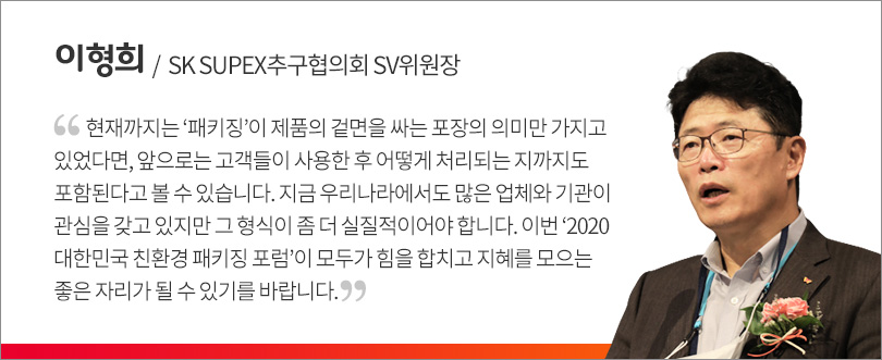 ‘2020 대한민국 친환경 패키징 포럼’은 11월 18일, 前 환경부 장관인 KIST 유영숙 교수의 개회사와 SK그룹의 ESG를 책임지고 있는 SUPEX추구협의회 SV위원회 이형희 위원장의 축사로 포문을 열었다.