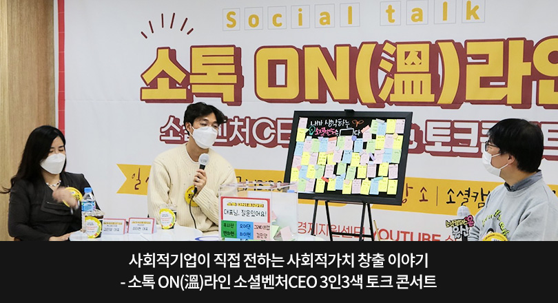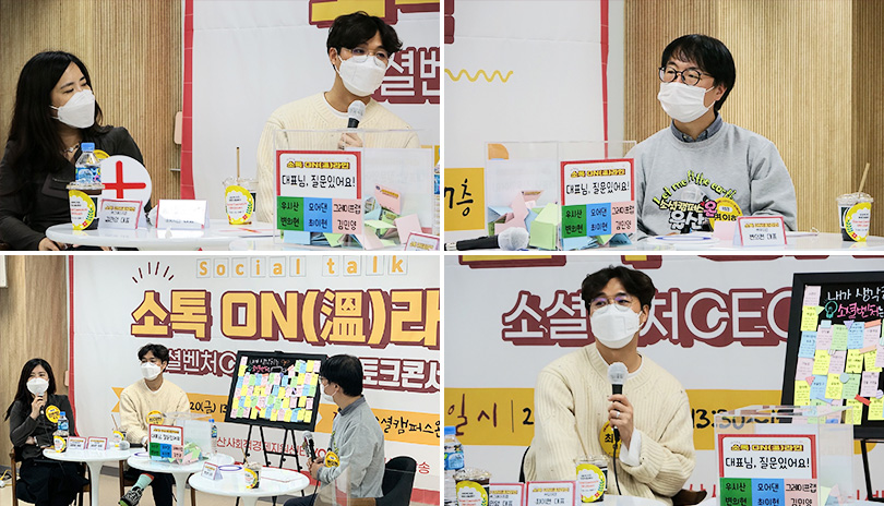 지난 11월 20일, 고용노동부, 한국사회적기업진흥원, 사회적기업 성장지원센터 소셜캠퍼스 온이 함께한 ‘소톡(Social Talk) ON(溫)라인 소셜벤처 CEO 3인3색 토크 콘서트(이하 토크 콘서트)’에 SK이노베이션이 육성 지원하는 사회적기업 대표들이 참여해 사회적가치 창출을 둘러싼 다양한 얘기를 나누는 시간을 가졌다.