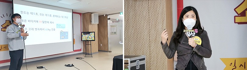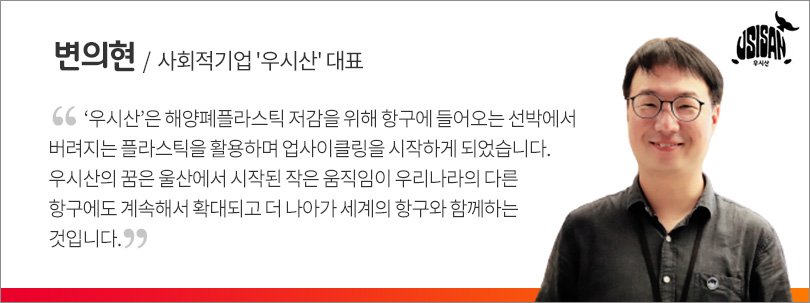 해양 폐플라스틱을 업사이클링*해 티셔츠, 에코백 등 다양한 친환경 제품을 만드는 사회적기업 우시산 변의현 대표는 강연에서 “만드는 데 5초, 쓰는 데 5분, 썩는 데는 500년이 걸리는 플라스틱을 먹고 죽은 해양생물들을 구하기 위한 사회적 미션을 가지고 시작했다”며 울산에서 시작된 목표가 세계적으로 확대되길 바란다는 소망을 전했다.