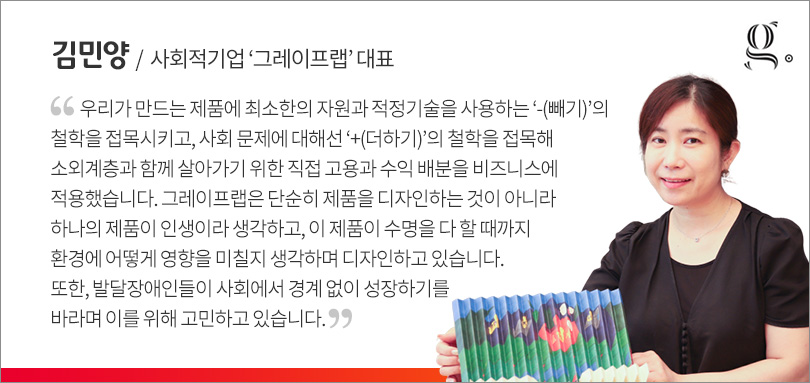 지속가능한 디자인을 추구하는 사회적기업 그레이프랩 김민양 대표는 “제품(Product) 디자인에서 시스템 디자인으로 관점을 바꾸게 됐다”면서 “상생하는 구조에 대한 매력을 느끼고 더 연구하여 포도송이(Grape) 구조를 만들어냈다”며 그레이프랩의 시작을 얘기했다. 더불어 제품을 통해 환경, 발달장애인과 상생하기 위한 그레이프랩의 고민을 나눴다.