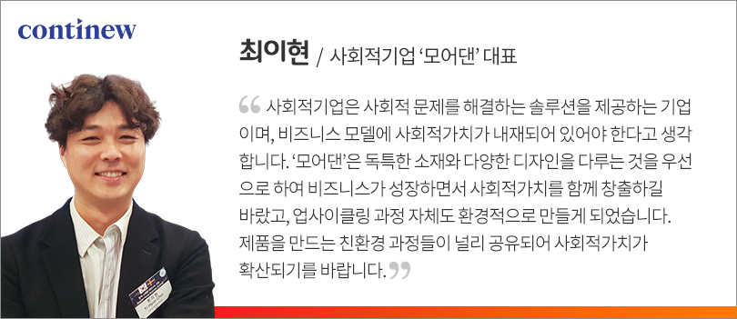 자동차 시트의 자투리 가죽, 안전벨트, 에어백 등을 업사이클링해 패션 제품을 제작하는 사회적기업 모어댄 최이현 대표는 강연을 통해 “사회적기업 스스로가 ‘사회적 문제 해결’이라는 것에만 집중하다 보면 밸런스가 무너질 수 있다”며 사회적가치와 이익 창출에 대한 밸런스를 갖춰 지속가능한 사회적가치를 창출하는 것이 중요하다는 것을 강조했다.