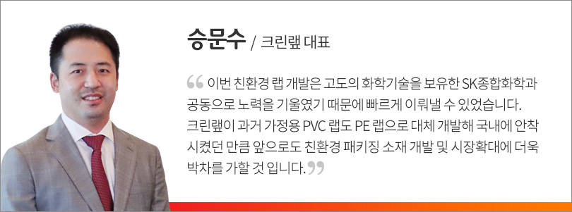 ‘업소용 친환경 PE 랩’은 SK종합화학이 자체 기술로 보유한 고기능성 폴리에틸렌 소재와 초박막 랩 설계 기술에 크린랲이 오랜 기간 축적해온 가정용 PE 랩 개발 노하우가 더해져 공동 개발에 성공했다. 이 제품은 인체에 무해하고 재활용이 가능한 가정용 PE 랩의 장점에 패키징이 용이하도록 하는 우수한 탄성까지 갖췄다. 뿐만 아니라 제품 소각 시 유해물질이 발생하지 않으며, 합성수지 제품과 분리하지 않아도 재활용할 수 있는 것이 특징이다.