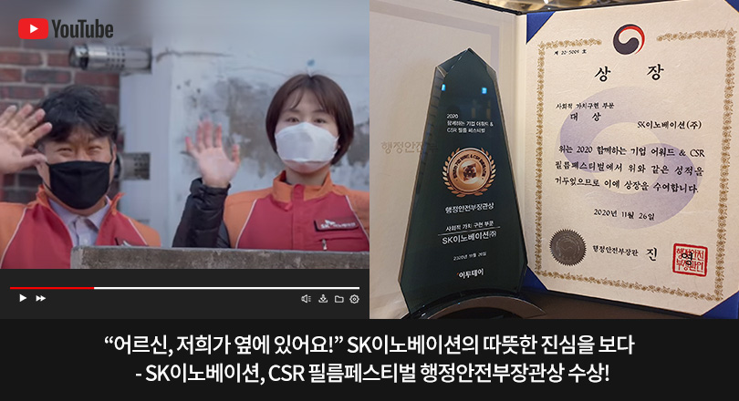 SK이노베이션이 제작한 ‘사회적 거리두기, 마음까지 거리두지 마세요! (Feat. 독거노인)’ 영상이 ‘2020 함께하는 기업어워드 & CSR 필름페스티벌’(이하 CSR 필름페스티벌)에서 행정안전부장관상(사회적 가치구현 부문)을 수상했다.