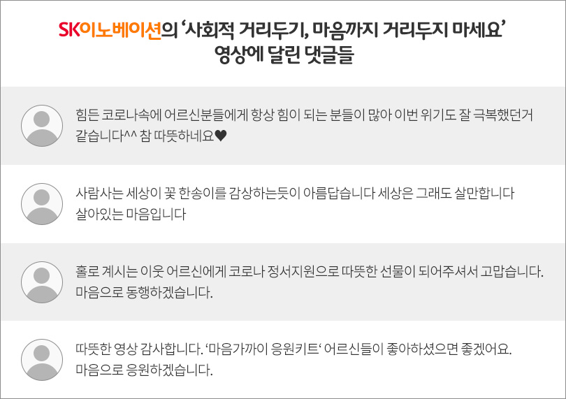 SK이노베이션이 지난 5월 4일 유튜브 채널에 게재한 ‘사회적 거리두기, 마음까지 거리두지 마세요! (Feat. 독거노인)’ 영상은 코로나19로 인한 사회적 거리두기로 어느 때보다 더 외롭고 힘든 나날을 보내고 있는 독거 노인에 대한 지속적인 관심과 따뜻한 응원이 필요하다는 메시지를 담았다. 이 영상은 당시에도 네티즌들의 큰 호응을 얻었으며 이번 CSR 필름페스티벌에서 ‘참신한 기획과 많은 사람들에게 공감을 주는 영상’ 이라는 평을 받았다.