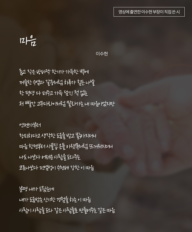 ▲ SK아이이테크놀로지 이수현 부장이 독거 노인을 위한 자원봉사활동을 다니며 느꼈던 마음을 직접 시로 작성했다.