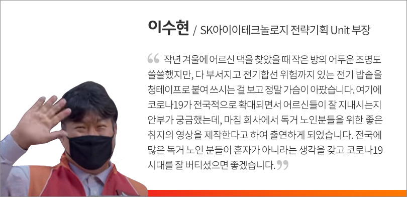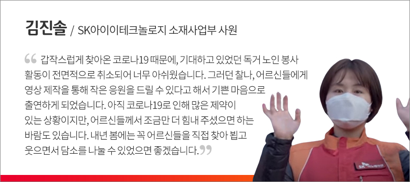 특히 이번 SK이노베이션의 독거 노인 응원 영상은 실제로 독거 노인과 결연을 맺어 봉사활동을 하고 있는 임직원 2명이 직접 출연해 더욱 따뜻한 감동을 선사했다. 사회적 거리두기로 인해 아쉽게도 행사에 직접 참석하지는 못했지만 SKinno News에 소감을 전해왔다.