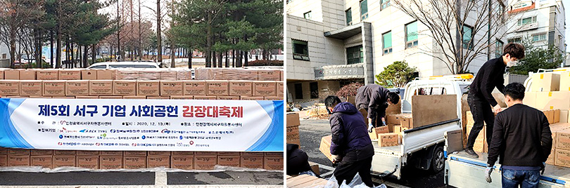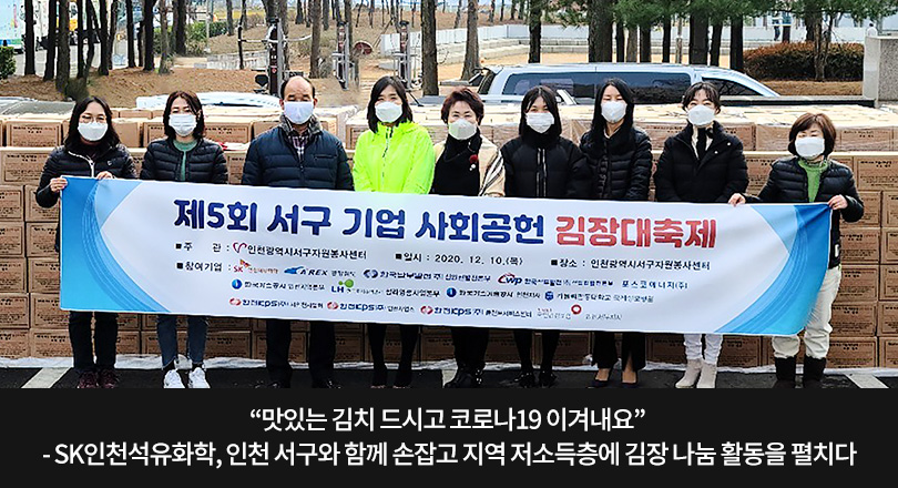 12월 10일 진행된 제5회 기업사회공헌 김장대축제에는 코로나19로 인해 어려운 분위기 속에서도 지역 이웃과 고통을 함께 나누고자 하는 마음이 모였다. SK인천석유화학을 비롯한 총 14개 기업체가 지역 이웃들을 위한 나눔에 동참했다.