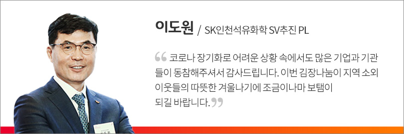 매년 다 함께 모여 직접 김장 김치를 만들던 행사는 올해 코로나19 장기화로 인한 사회적거리두기 2.5단계 지침에 따라 미리 구매한 김장김치를 각 동 행정복지센터 및 사회복지시설 등에 비대면 전달하는 것으로 대체됐다. SK인천석유화학과 14개 기업체가 함께 준비한 김장김치 총 2,040박스(20톤 상당)는 각 동 행정복지센터 및 복지관, 사회복지시설 등을 통해 2,000여 명에게 전달했다.