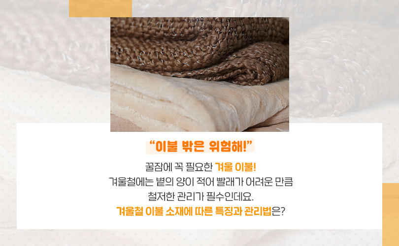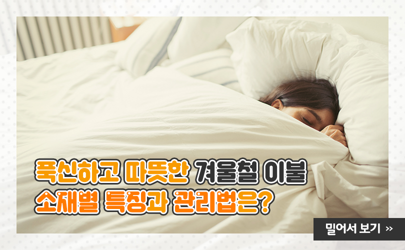 이불 밖은 위험해! 겨울철 이불 소재와 관리법은? 2020. 12. 17 SK이노베이션 1분 읽기 이불 밖은 위험해! 겨울철 이불 소재와 관리법은? AI 요약 AI 보이스 이불 밖으로 나가기 싫은 겨울! 내게 맞는 따뜻하고 포근한 겨울철 이불 소재와 관리법, 그리고 이불 속에 숨어 있는 석유화학까지 카드뉴스로 알아보자. 미디어 키트 이전글 상식in 석유화학 이불 다음글 연관 콘텐츠 ENERGY INSIGHT 겨울철, 안전한 드라이브를 위한 자동차 관리법 2019.12.26 . 추운 겨울 제대로 즐기자! 겨울철 필수 내일로 코스 추천 :) 2018.02.01 . 와, 겨울이다! 겨울철 안전운전을 위한 자동차 월동준비 2016.11.29 . [겨울철 차량관리법] 올겨울 최대 한파! 안전운행을 위한 차량관리 체크리스트 2016.01.22