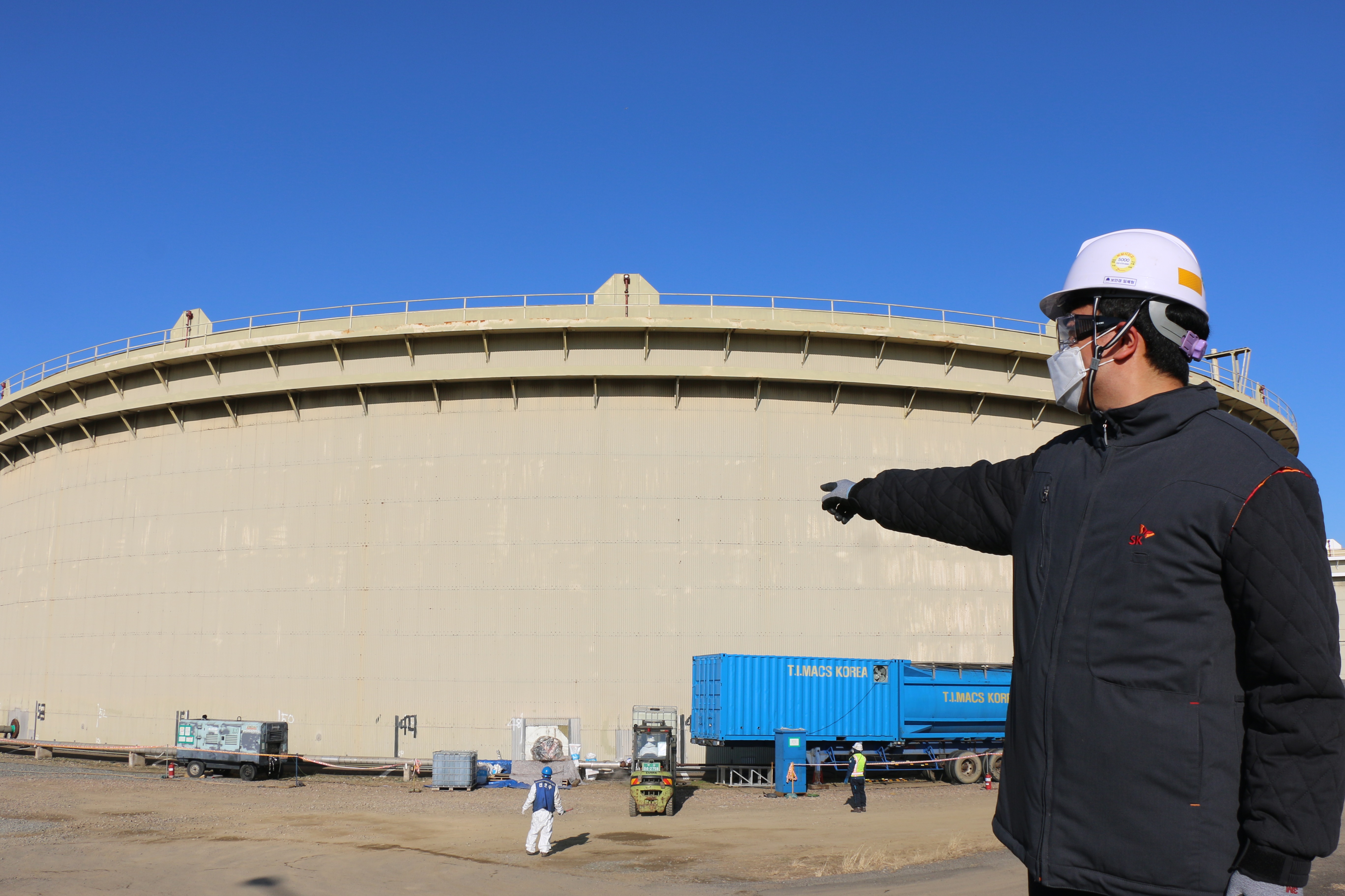 (사진 1) SK인천석유화학 엔지니어가 개방 검사 중인 원유 탱크 앞에서 새로 개발한 친환경 탱크 클리닝 기술을 설명하고 있다.