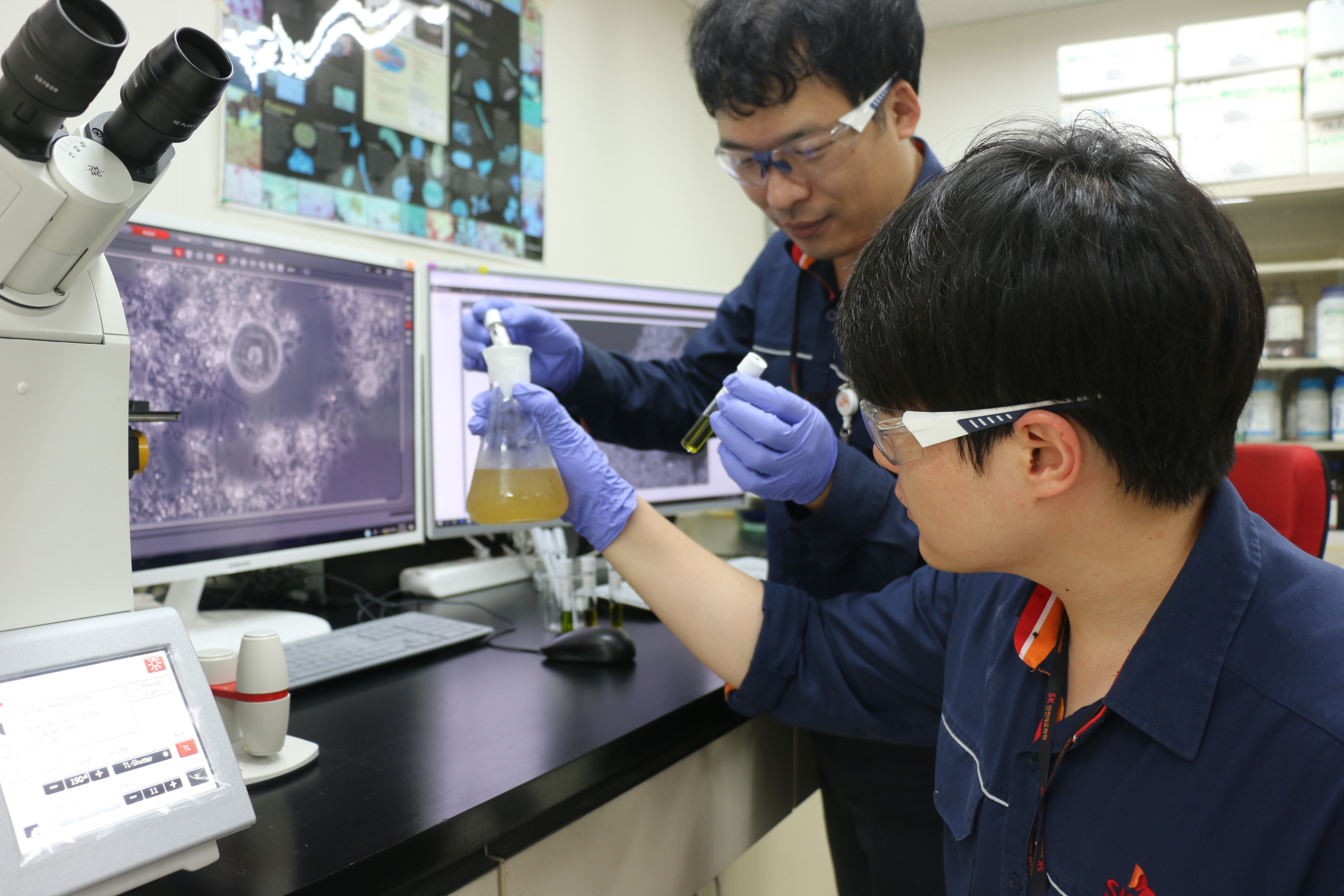 (사진 2) SK인천석유화학 엔지니어들이 사내 폐수처리장 내 실험실에서 미생물 영상 이미지 분석 작업을 수행하고 있다.