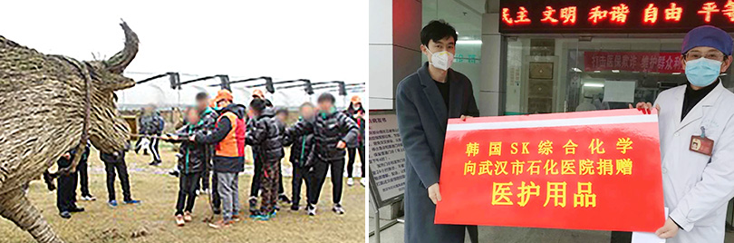 ▲ (왼쪽) 중국 창저우 LiBS법인 구성원들이 사업장 인근에 위치한 발달장애인 학교인 ‘진탄구계지학교’를 찾아 봉사활동을 하고 있다. / (오른쪽) SK종합화학과 시노펙이 합작해 설립한 중한석화는 우한시 석화병원에 방역물품을 기부했다.