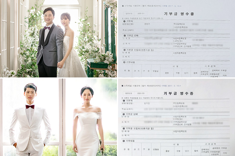 ▲ (위) 올해 결혼한 SK인천석유화학 운영2 Unit 윤현수 주임(좌측) 부부와 기부금 영수증 / (아래) 올해 결혼한 SK인천석유화학 정유1 Unit 김기건 주임(좌측) 부부와 기부금 영수증