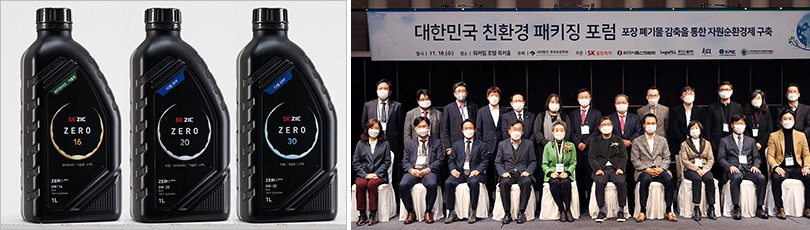 ▲ (좌) 업사이클링 소재의 친환경 용기를 적용한 SK루브리컨츠의 엔진오일 ‘SK ZIC ZERO’, (우) SK종합화학과 패키징 산업 관련 민·관·학이 한데 모여 ‘포장 폐기물 감축을 통한 자원순환경제 구축’에 대해 논의한 ‘2020 대한민국 친환경 패키징 포럼’