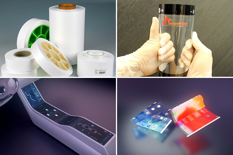 ▲ SK아이이테크놀로지의 LiBS(Lithium-ion Battery Separator, 좌측 상단)와 FCW(Flexible Cover Window, 우측 상단) / SK아이이테크놀로지의 FCW가 적용된 플렉서블 디스플레이 (하단)