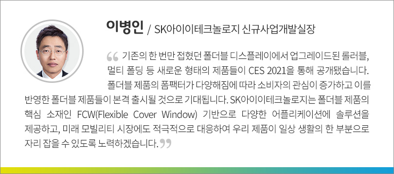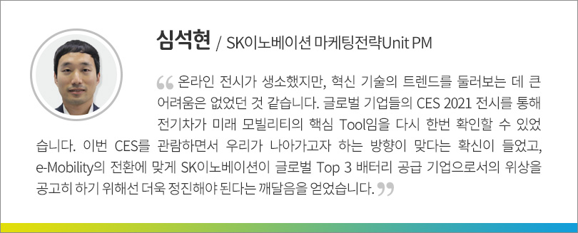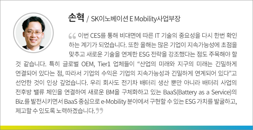 이번 ‘CES 2021’은 자동차부터 디지털 헬스, 5G, 스마트시티까지 광범위한 분야에 기술 기반의 혁신이 진행되고 있음을 여실히 보여주고 있었다. 또한 SK이노베이션을 비롯한 SK그룹의 화두인 ESG가 글로벌 기업들에게도 매우 중요한 가치로 자리 잡음을 확인할 수 있던 자리였다.