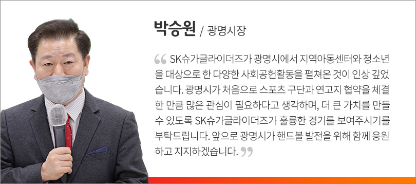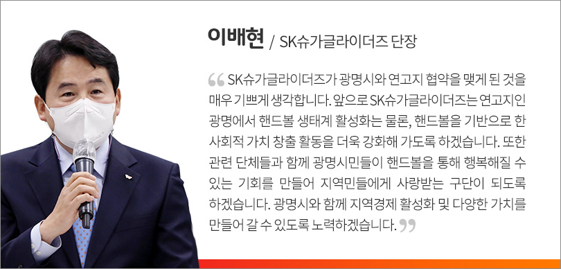 SK슈가글라이더즈는 연고지 협약 체결 이전부터 광명시와 특별한 인연을 맺어왔다. 지난해 2월 SK슈가글라이더즈는 광명 시민체육관을 홈 구장으로 새롭게 맞이한 바 있으며, 이를 바탕으로 절치부심해 2019-2020 SK핸드볼 코리아리그에서 우승을 차지했다.