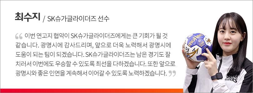 이를 위해 SK슈가글라이더즈는 1월 20일, 광명시청에서 연고지 협약식을 개최했으며 이 자리에는 박승원 광명시장, 핸드볼 국가대표 출신인 더불어민주당 임오경 의원(광명 갑), SK슈가글라이더즈 이배현 단장, 박성립 감독, 최수지 선수 대표 등 행사 관계자가 함께했다.