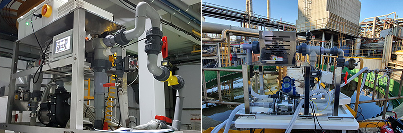 ▲ (좌) 친환경 소셜벤처 ‘에이런’이 개발한 마이크로 필터링 시스템(NCFS, Non-Clogging Filtering System) / (우) 산업 현장에서 ‘에이런’이 마이크로 필터링 시스템을 테스트하고 있다.