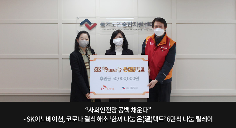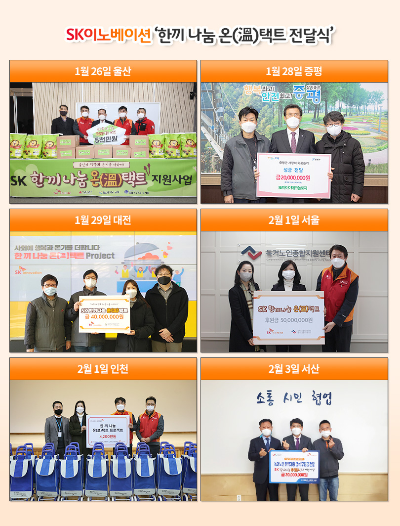 이를 위해 SK이노베이션은 지난 1월 26일부터 2월 3일 서산을 마지막으로 서울, 울산, 인천, 서산, 증평 등 전국의 사업장에서 독거노인 및 노숙인 등 취약계층에게 따뜻한 한끼 식사를 전하는 ‘한끼 나눔 온(溫)택트 전달식’을 마쳤다.