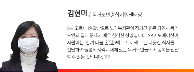 SK이노베이션은 이를 팬데믹 상황에서의 중대한 사회문제로 인식했으며, 긴급 지원이 필요한 ‘사회안전망(Safety Net)의 공백’으로 간주하고 결식 위기에 놓인 독거노인 및 노숙인을 대상으로 적극적인 지원에 나섰다.