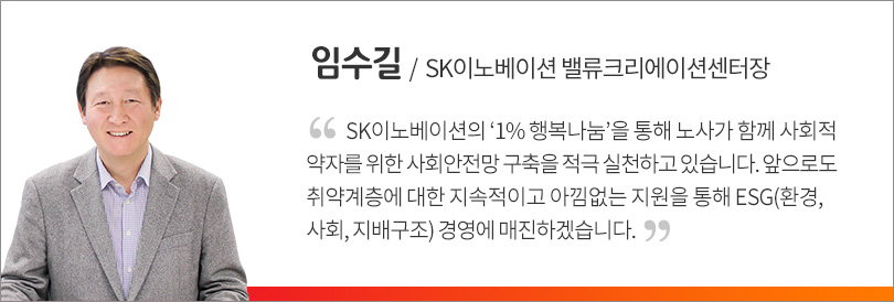 또한 SK이노베이션이 ‘한끼 나눔 온(溫)택트 프로젝트’를 위해 이번에 전달한 총 2억 2천 1백만 원은 사회와 더 큰 행복을 나누기 위해 지난 2017년부터 SK이노베이션 구성원들이 자발적으로 기본급 1%를 기부해 조성하는 ‘1% 행복나눔’ 기금으로 지원돼 의미를 더했다.