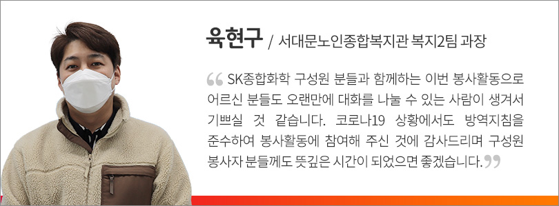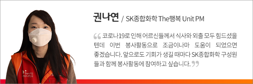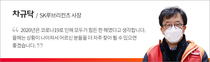 용산구에 거주하는 결식위기 독거노인 가정에 도시락과 선물을 전달한 이날 봉사활동 현장에는 따뜻함이 넘쳤다. 독거노인 가정을 향하는 SK루브리컨츠 차규탁 사장과 구성원들은 그간 찾아 뵙지 못했던 어르신 분들을 직접 만날 생각에 기쁨과 설렘이 가득한 얼굴을 보였다. 독거노인들 또한 코로나19로 한동안 만나지 못했던 이들을 따뜻하게 맞아줬다.