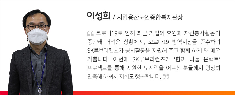 같은 날 SK루브리컨츠 차규탁 사장과 구성원들도 독거노인 가정을 방문하기 전 시립용산노인종합복지관을 먼저 찾아 오리엔테이션을 가졌다. 구성원들은 우리의 작은 관심이 어려운 이웃들에게는 큰 감동과 행복으로 전해진다는 것을 마음에 새기며, 독거노인들에게 전달할 밥/국/반찬 7종으로 구성된 도시락과 마스크에 진심을 더하는 메모 스티커를 부착했다. 더불어 독거노인의 건강을 위한 견과세트를 별도로 준비해 온기를 더했다.