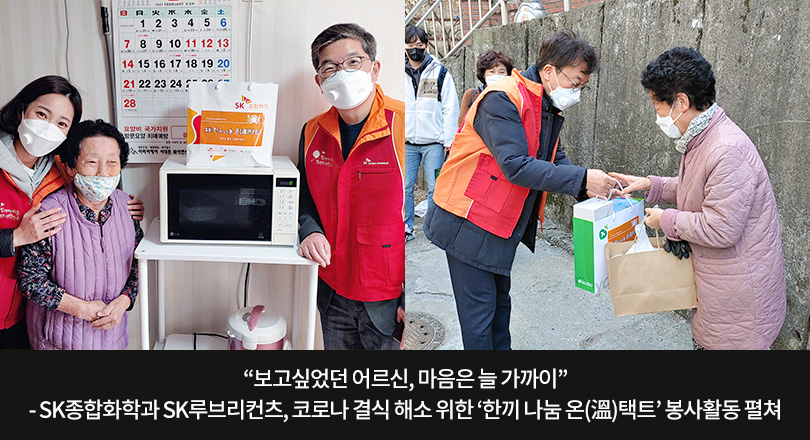 SK종합화학 나경수 사장과 SK루브리컨츠 차규탁 사장은 2월 26일, 구성원들과 함께 거동이 불편해 결식위기에 놓인 독거노인들을 위해 ‘SK이노베이션 계열 한끼 나눔 온택트’ 봉사활동을 펼쳤다. 독거노인 총 59가정에 직접 방문해 따뜻한 마음을 담은 도시락은 물론 별도로 준비한 마스크, 견과류 및 다과 등을 전달하며 행복과 온기를 나눈 것이다. 또한, 이번에 전달된 도시락은 지역 시장에서 식자재를 구매하고 영세 식당이 직접 만드는 등 코로나19로 경영 위기를 겪고 있는 지역 소상공인과 상생한다는 점에서 그 의미를 더했다.