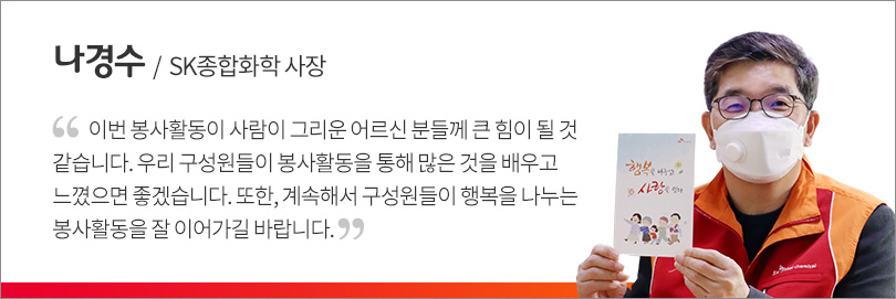 SK종합화학은 지난 2016년부터 구성원 자원봉사활동 프로그램인 ‘행복나눔 사랑잇기’를 통해 서울 서대문구에 거주하는 독거노인과 결연을 맺고, 봉사활동을 꾸준히 이어오고 있다.