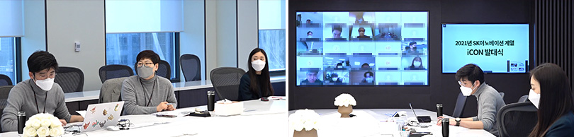▲ 지난 2월 18일, SK이노베이션 계열 iCON들이 화상 미팅 플랫폼인 웨벡스(Webex)를 통해 비대면 발대식을 진행하고 있다. (좌측 사진 중 가운데 SK이노베이션 안옥경 행복경영실장)