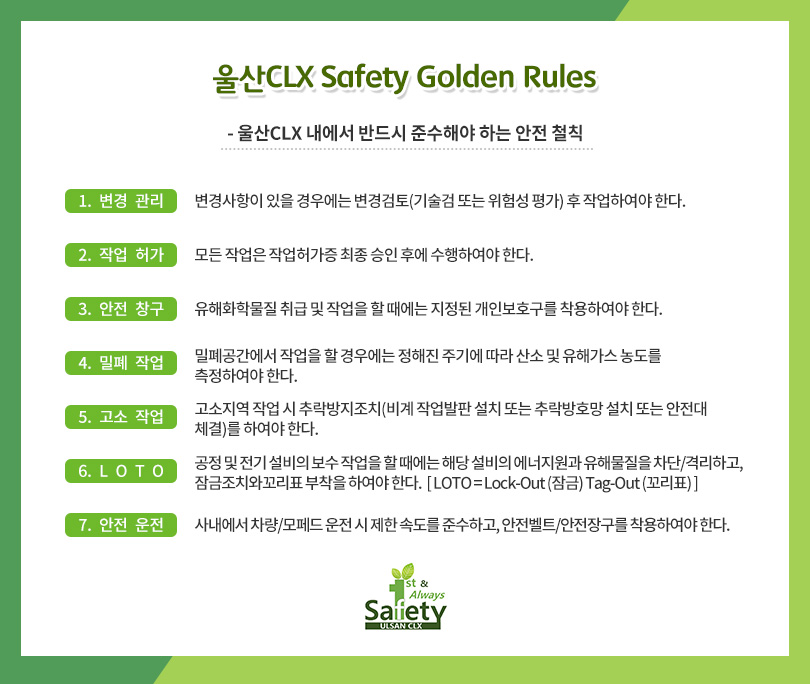 마지막으로 울산CLX 구성원 및 협력사가 반드시 지켜야 하는 ‘SGR(Safety Golden Rules)’ 안전수칙 역시 전보다 한눈에 확인하기 쉬운 메시지 중심으로 개정됐다. SGR 안전수칙에는 현장 작업 수행 시 변경 관리 대상인지 확인/조치 후 작업 허가를 받고, 작업 내용에 맞는 안전장비 착용을 한 뒤 작업을 시작해야 한다는 등의 내용이 담겨있다. 위험이 상존하는 산업 현장에서 사고 예방을 위해 꼭 알아두고 실천해야 할 안전 철칙들이 보다 간결하고 명확하게 반영된 것이다.
