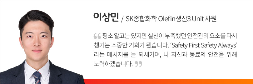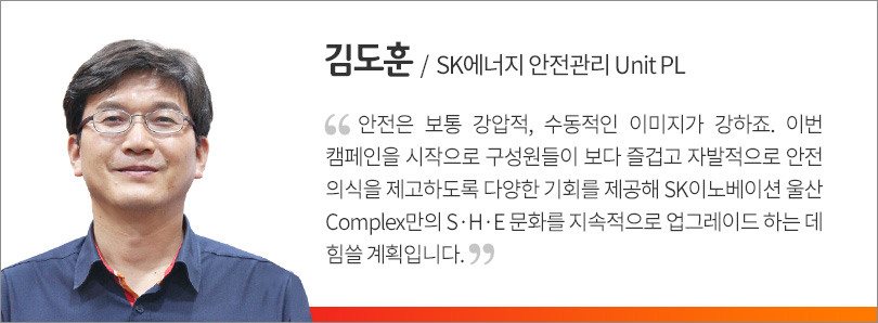 S·H·E*를 최우선으로 하는 SK이노베이션 울산Complex(이하 울산CLX)는 올해를 ‘울산CLX 안전문화 혁신 추진 원년’으로 선포하고, 협력사를 포함한 모든 구성원의 안전의식 및 본질적인 행동 개선을 위해 다양한 방안을 추진하고 있다. 이와 함께 구성원의 공감과 참여를 기반으로 현장 안전을 더욱 촘촘하게 관리하고자 3월부터 ‘세이프티 퍼스트 세이프티 올웨이즈(Safety First Safety Always)’ 캠페인을 본격적으로 시행한다.