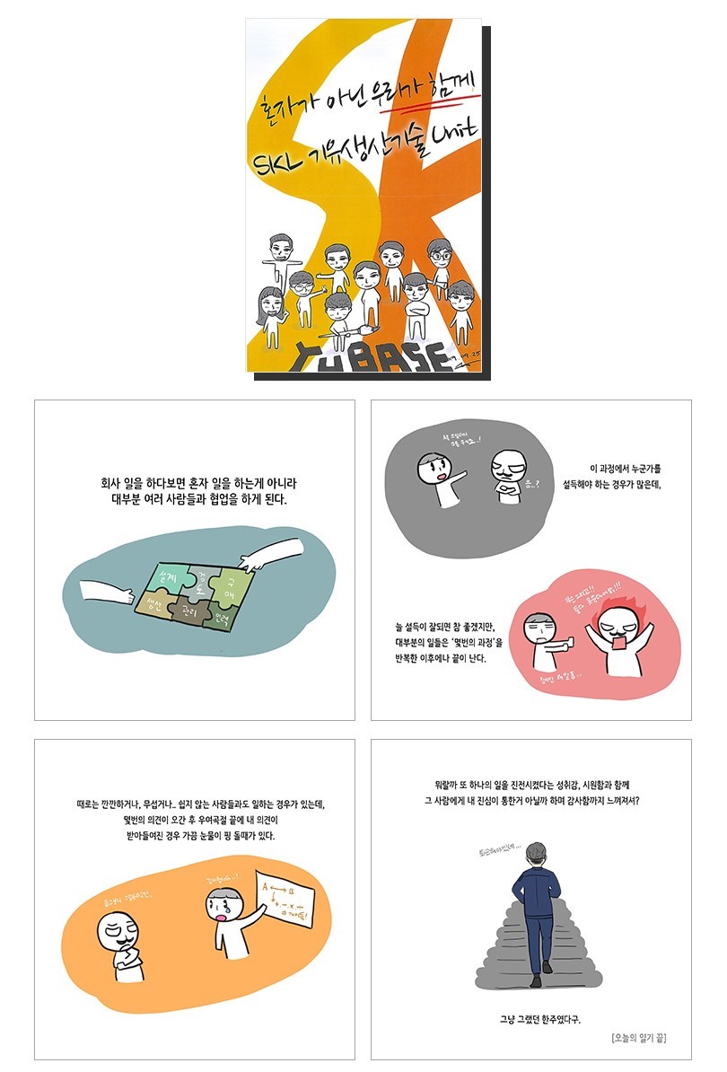 이민철 PM은 마음을 담아 동료들에게 한 편의 일러스트를 전했다. ‘혼자가 아닌 우리가 함께’라는 제목으로 동료들과 일하며 겪고 쌓은 일상의 한 갈피를 그려낸 것이다. 네 컷의 짧은 스토리에는 SK루브리컨츠 기유기술·관리 Unit에 대한 소속감이 깊게 배어있다.