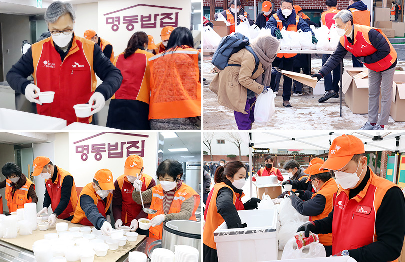 ▲ (상단 좌측) 지난 2월 5일, ‘명동밥집’에서 진행된 한끼 나눔 온택트 봉사활동’에 참여한 SK에너지 조경목 사장과 구성원들이 노숙인들에게 전달할 국을 포장하고 있다. / (상단 우측) SK에너지 조경목 사장(오른쪽)이 노숙인에게 도시락과 마스크를 전달하고 있다. / (하단) ‘한끼 나눔 온택트 봉사활동’에 참여한 SK에너지 구성원들이 노숙인들에게 전달할 도시락을 준비하고 있다.
