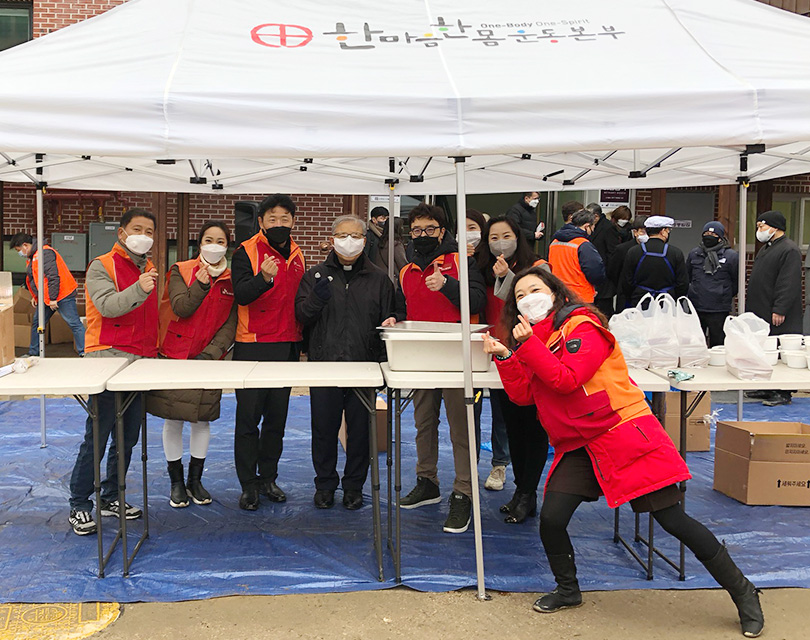 ▲ 3월 31일, 천주교서울대교구에서 운영하는 무료 급식소 ‘명동밥집’에서 SK이노베이션 계열 구성원들이 마지막 봉사활동을 진행하고 있다.