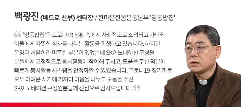 하지만 사회안전망(Safety Net) 공백에 따른 긴급 지원으로 빠르게 프로젝트가 진행됐고, 코로나19가 확산되는 상황에서 자원봉사자 모집이 여의치 않아 ‘명동밥집’ 운영에 어려움이 있었다. 이러한 가운데SK이노베이션이 자발적으로 봉사활동 추진에 앞장서서 구성원을 대상으로 한 봉사자 모집을 진행했다. 코로나19 장기화에도 불구하고 구성원들의 뜨거운 참여로, SK이노베이션은 모집을 시작한 지 이틀 만에 3개월간 총 23회의 봉사활동에 참여할 봉사자 전원을 모집했다. 사회적 거리는 멀어졌지만 어려운 이웃을 생각하는 구성원들의 마음의 거리는 보다 가까워진 것이다.