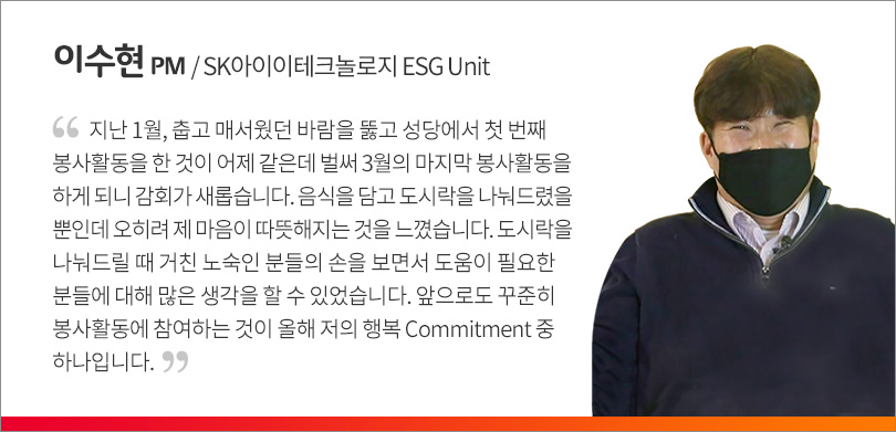 SK이노베이션 계열 구성원들의 마지막 봉사활동이 진행된 3월 31일 ‘명동밥집’ 현장은 그 어느 때 보다도 활기가 넘쳤으며, 끝까지 성공적으로 마무리한 구성원들과 봉사활동 관계자들은 뿌듯함과 아쉬움을 서로에게 표현했다.