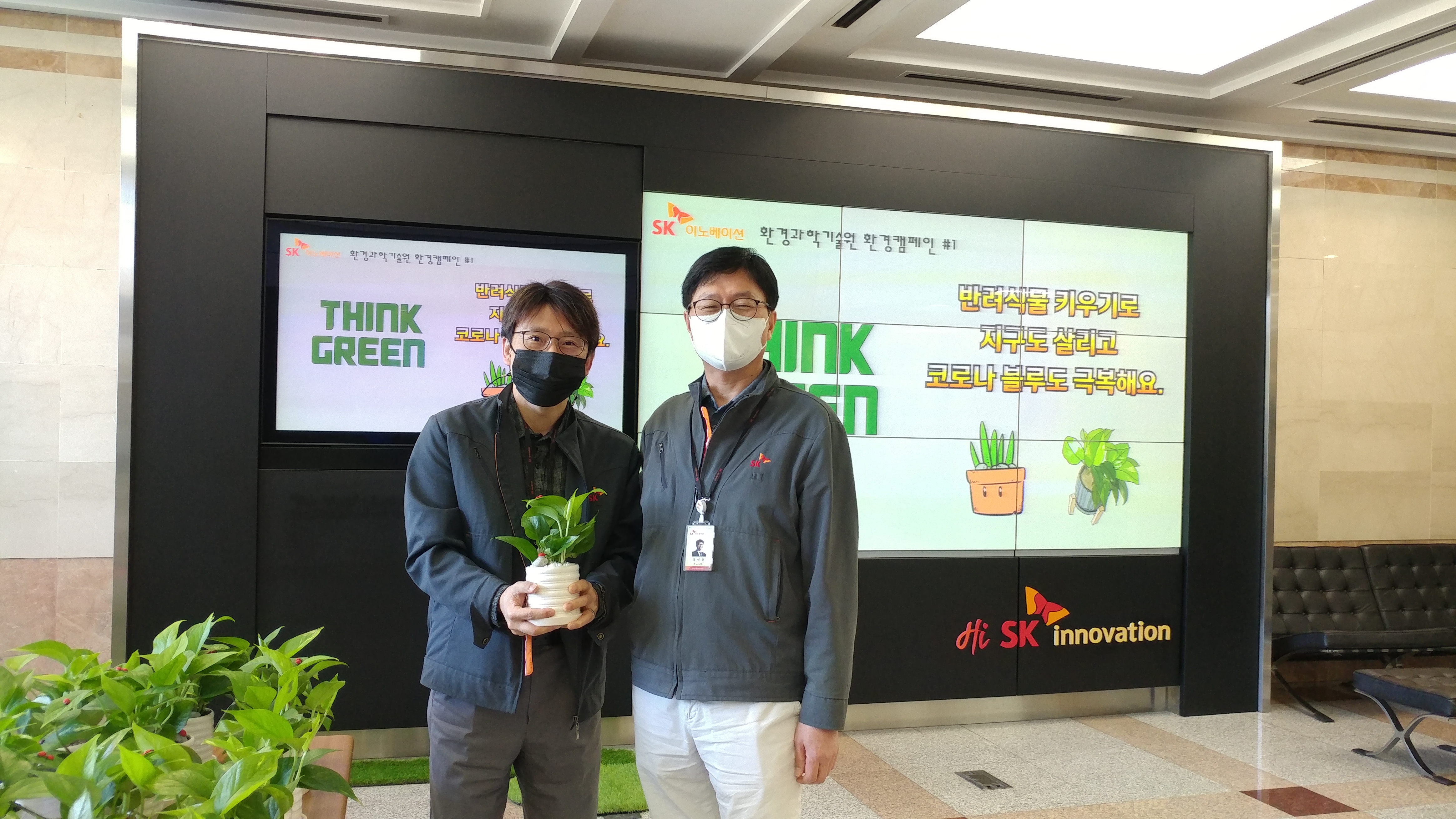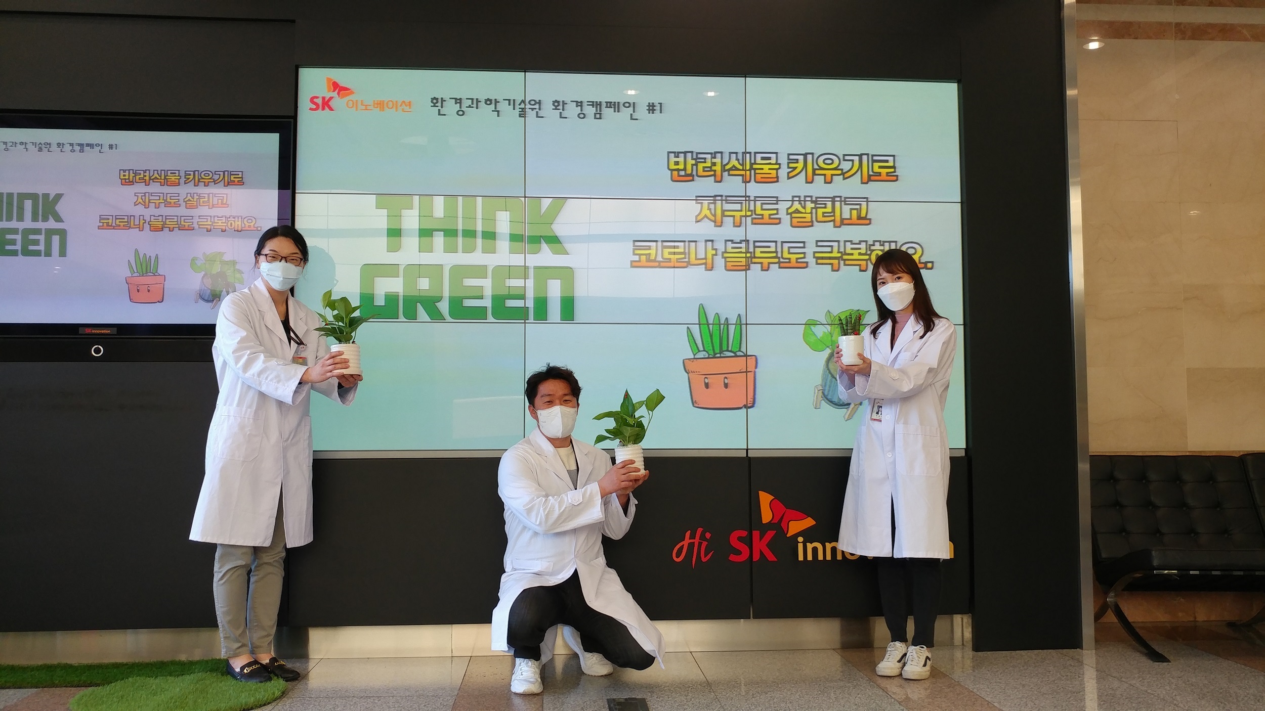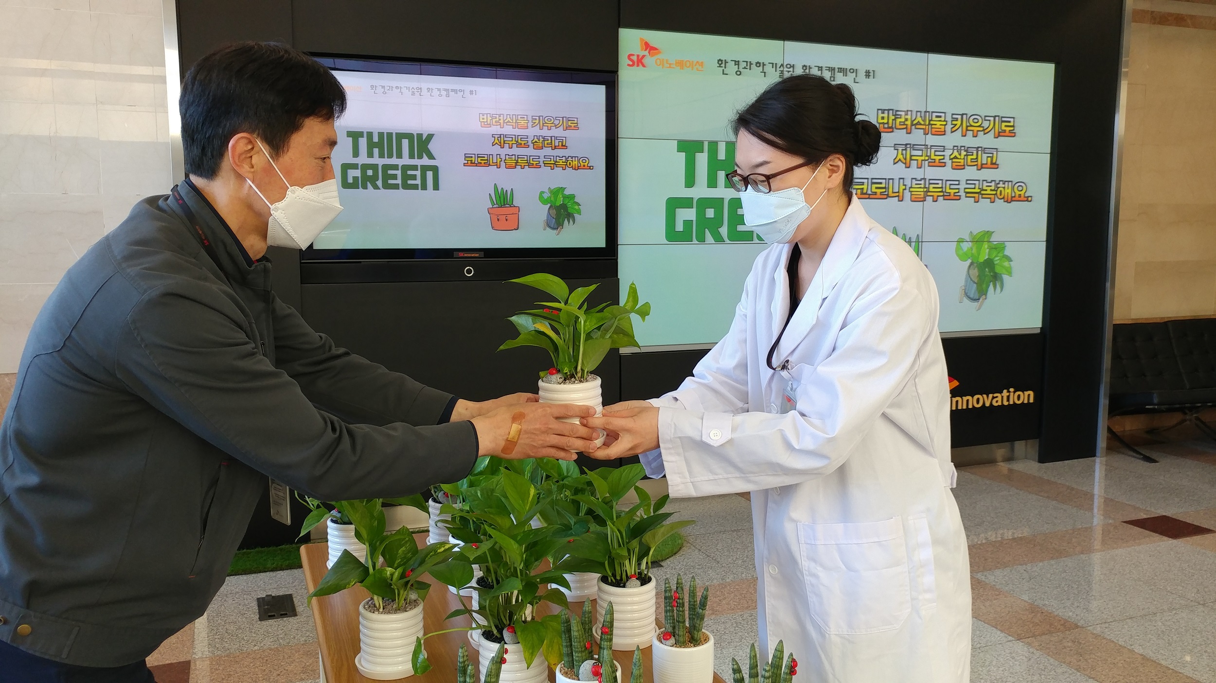 SK이노베이션 환경과학기술원은 식목일인 4월 5일, “반려식물 키우기”를 신청한 구성원 중 선착순 100명에게 코로나 방역수칙을 준수하여 개별적으로 스투키 또는 스킨답서스 화분을 전달했다. 구성원들에게 인기리에 마감되어 준비한 화분 물량이 모두 소진돼 다음주에 약 80여개를 추가로 준비할 예정이다. 이성준 환경과학기술원장은 반려식물 전달 행사에 직접 참여해 지구를 살리고 환경을 보호하고자 하는 환경과학기술원의 환경캠페인을 응원했다.