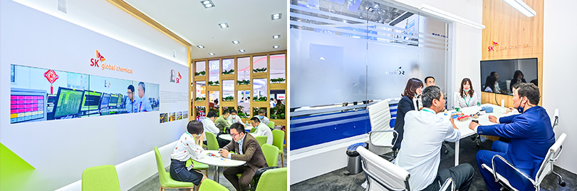 ▲ SK종합화학 부스 내 마련된 중한석화 라운지(좌) 및 회의실(우)