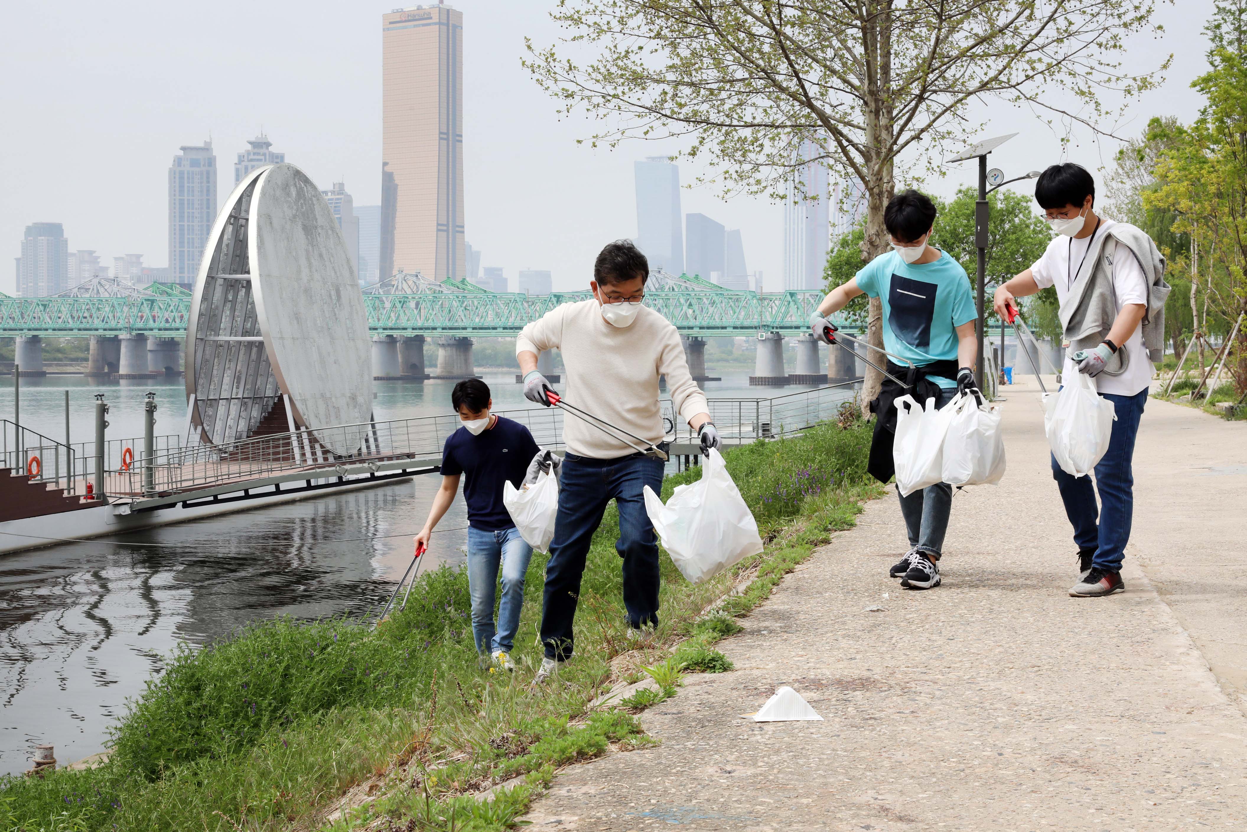 (사진2) 22일 한강시민공원에서 SK종합화학 구성원들과 플로깅을 진행하고 있는 나경수 사장 (왼쪽 두번째, SK종합화학 나경수 사장)