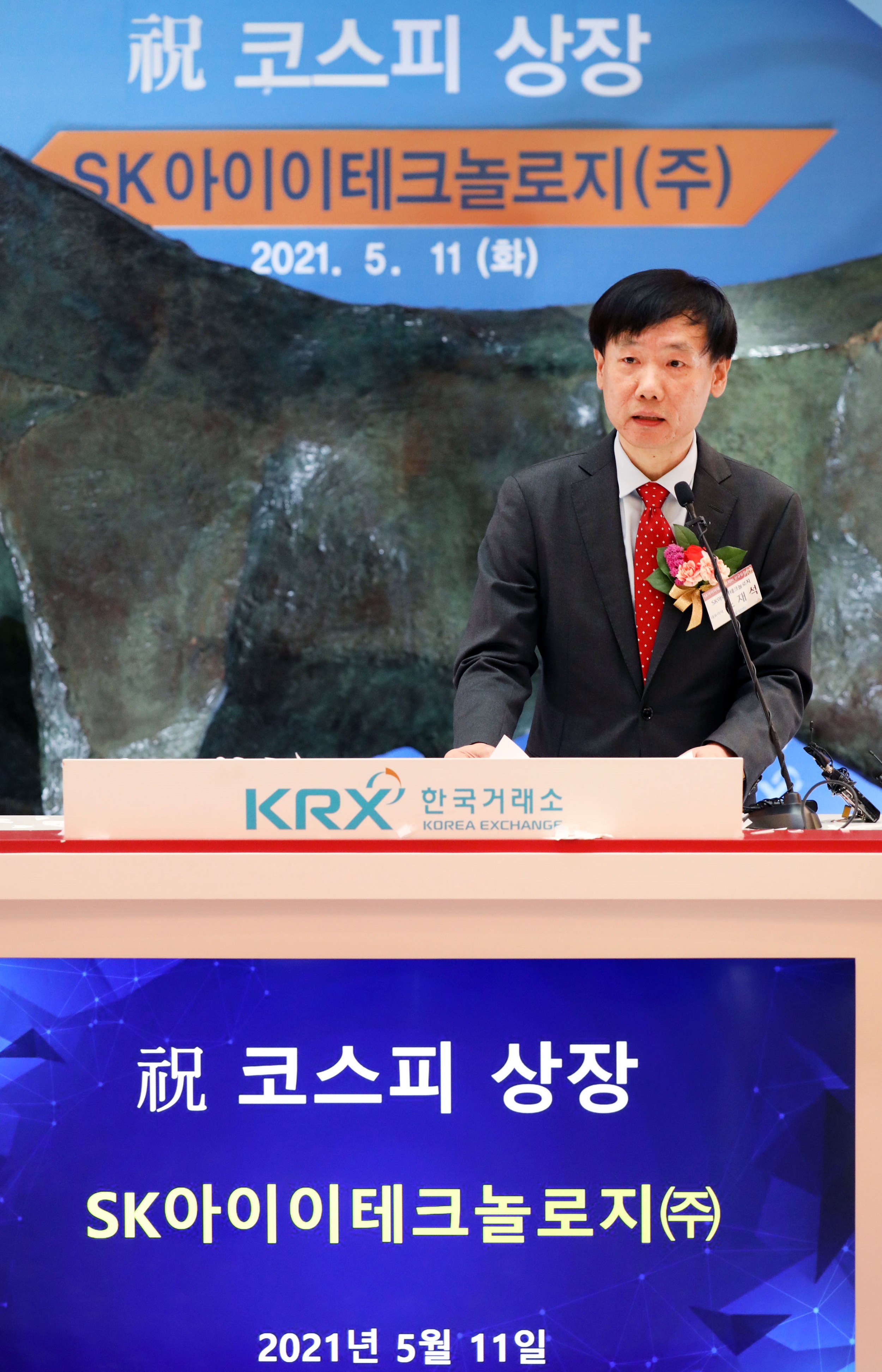 (사진4) SK아이이테크놀로지가 오늘 유가증권시장에 상장했다. SK아이이테크놀로지 노재석 대표가 이날 서울 여의도 한국증권거래소에서 열린 상장기념식에서 상장소감을 발표하고 있다.